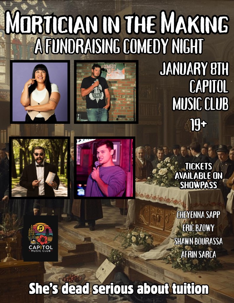 Get ready for a night to die laughing as we bring four incredible comedians together for a special fundraising event in support of tuition for a future funeral director! Join us on January 8th at the iconic Capitol Music Club in Saskatoon for an unforgettable evening of stand-up, good spirits, and community generosity.